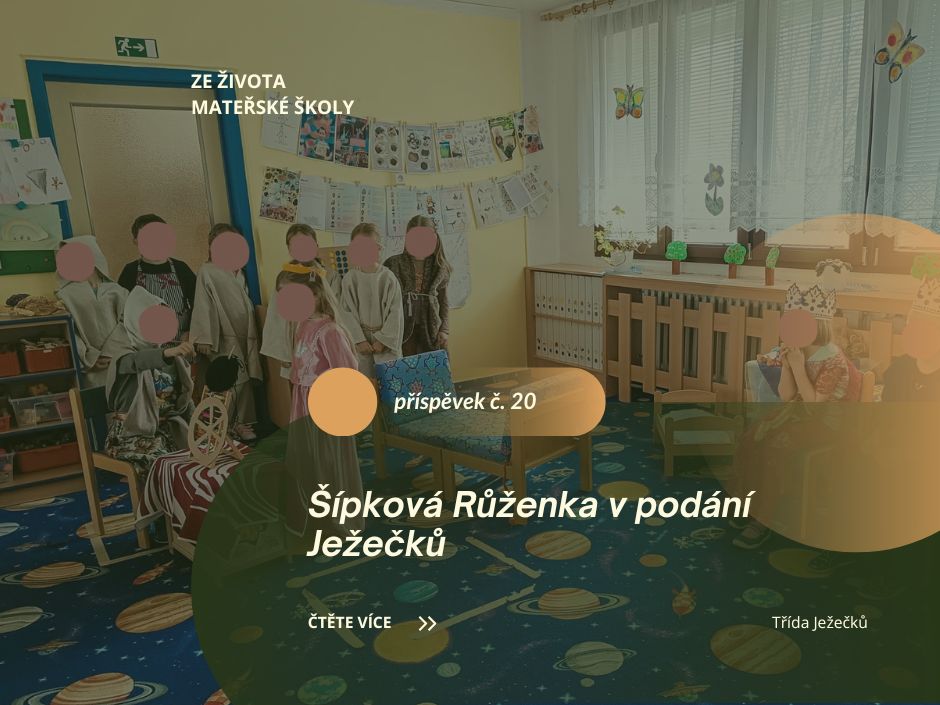 Děti ze třídy Ježečků se v rámci pohádkového tématu, inspirované Nocí s Andersenem, pustily do nacvičení krátkého pohádkového muzikálu Šípková Růženka. Své vystoupení pak s nadšením předvedly dětem z ostatních tříd.